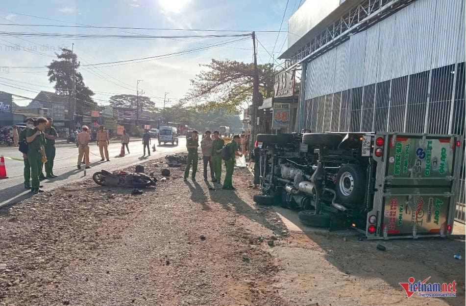Cú va chạm mạnh khiến xe tải bị lật rồi tông vào 2 xe máy. Hậu quả, 1 người phụ nữ điều khiển xe máy tử vong tại chỗ; 2 người khác bị thương nặng, được đưa đi cấp cứu tại Trung tâm Y tế Kiến Đức.